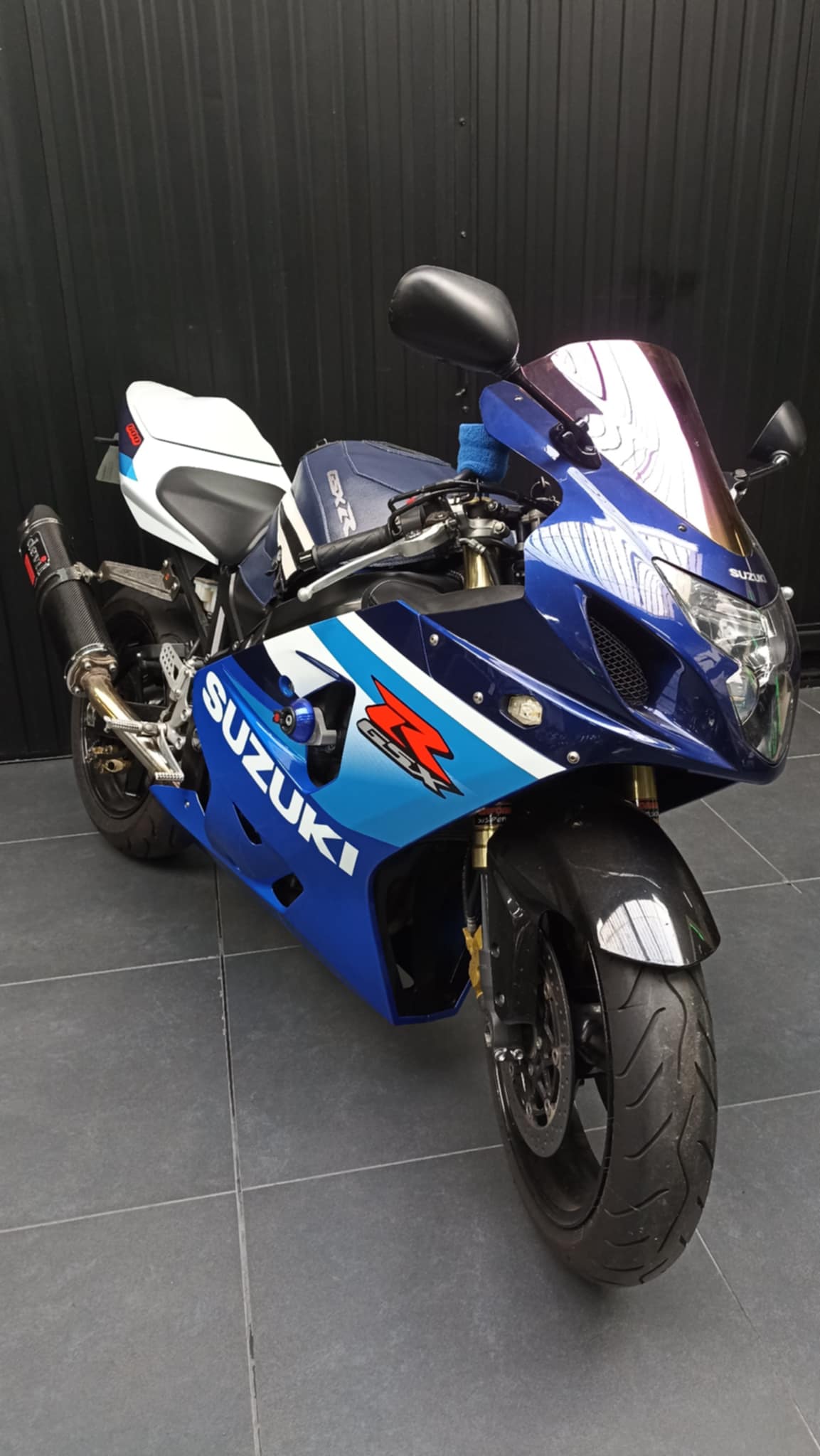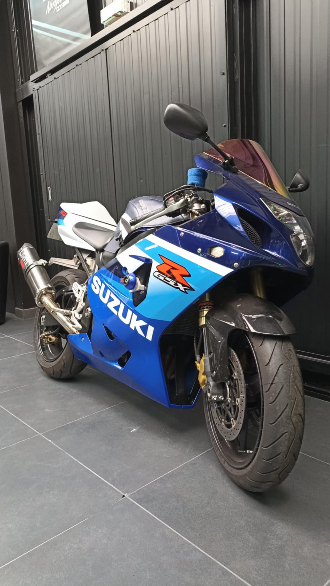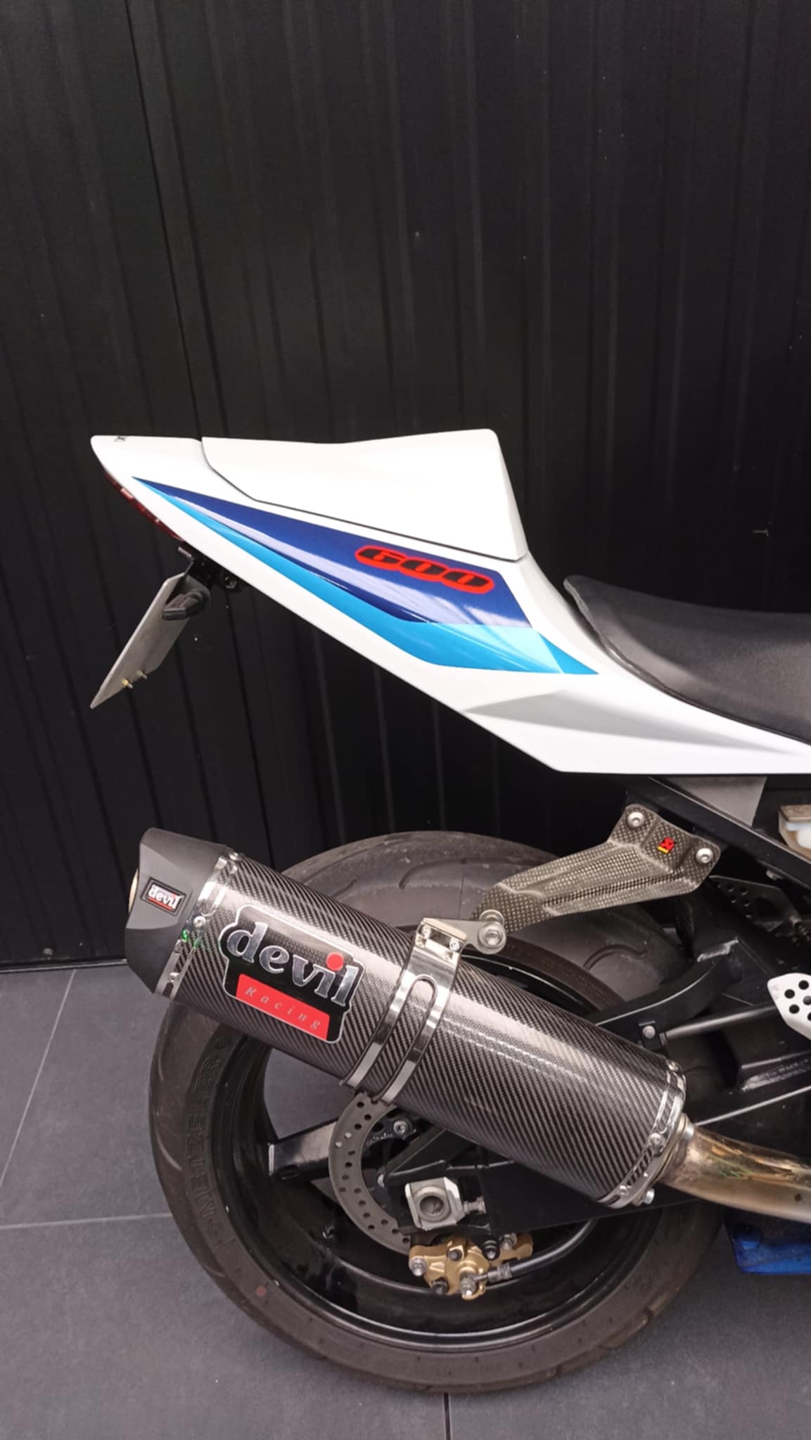 équipements : support de plaque court, clignotants leds, bulle irridium, silencieux devil carbone, tapis de réservoir bagster, capot de selle, tampon de protection.